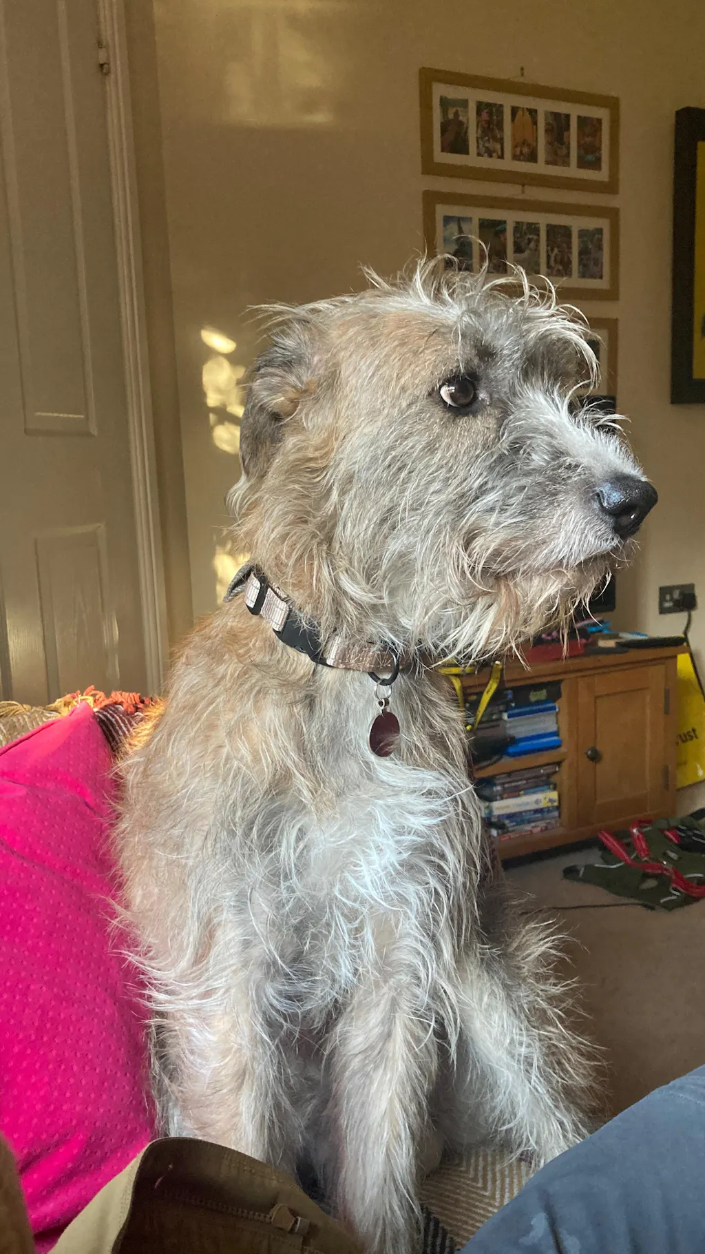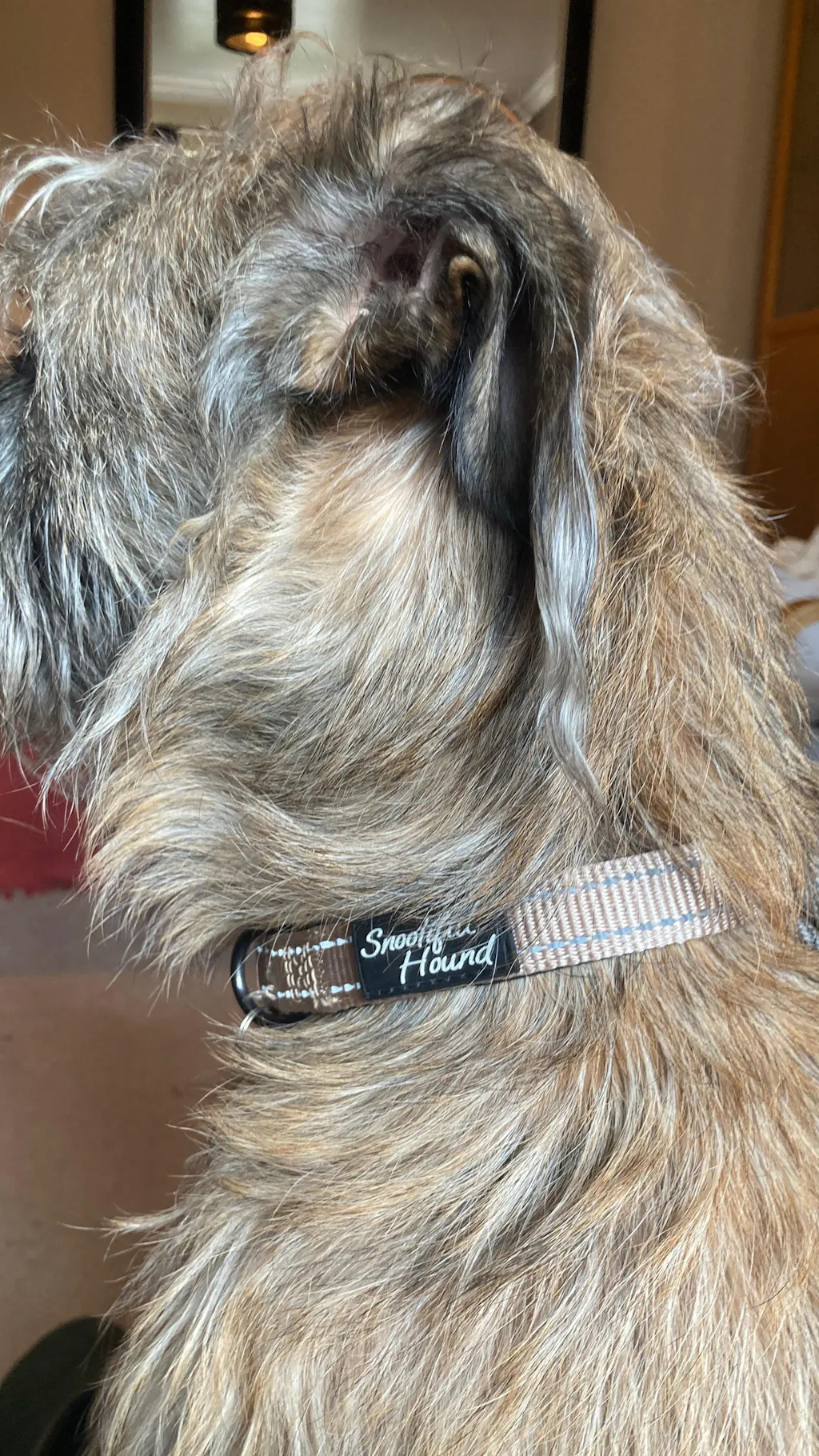 Bought to replace a free collar from the dogs’ home. My hairy lurcher seems to find it comfortable, the adjustment is easy, and although he doesn’t have an issue with putting things over his head (as we were told), the clip is useful for dogs that do. I love the tan colour which sets off my dog’s brindle coat well. As it has a sheen, it sometimes reflects more dusky pink in colour and the reflective stitching by nature is often lighter than pictured. Bought alongside a martingale and hound collar which both interact fine with the ID collar.